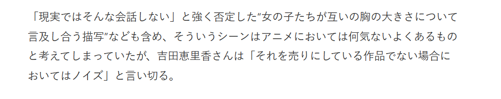 她随后还表示:这样的福利场景非常常见,就比如动漫中经常出现的“女孩互相提及对方乳房大小的描绘”;吉田惠里香强烈认为:这样的对话在现实生活中不存在!