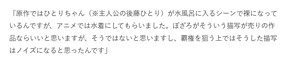 其中在第五小节,她谈到了《孤独摇滚》的原作中有个设定是女主角波奇酱因为不想打工,就去泡冰水澡想感冒逃避。但她非常不喜欢漫画中这个画面,因为波奇酱是完全裸体的泡澡.....她非常反感这种“角色被性消耗”的表达方式,于是她在动画中要求制作组为波奇酱穿上死库水泳衣。