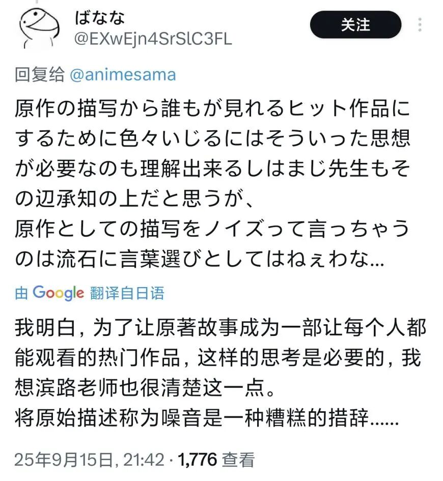 不知道屏幕前的你怎么看,咱们先来看看日本网友们怎么看。首先有部分网友表示:对原作进行合理的改编可以理解,原作者肯定理解这一点,但将原作中的内容描述为“杂音”非常不妥。