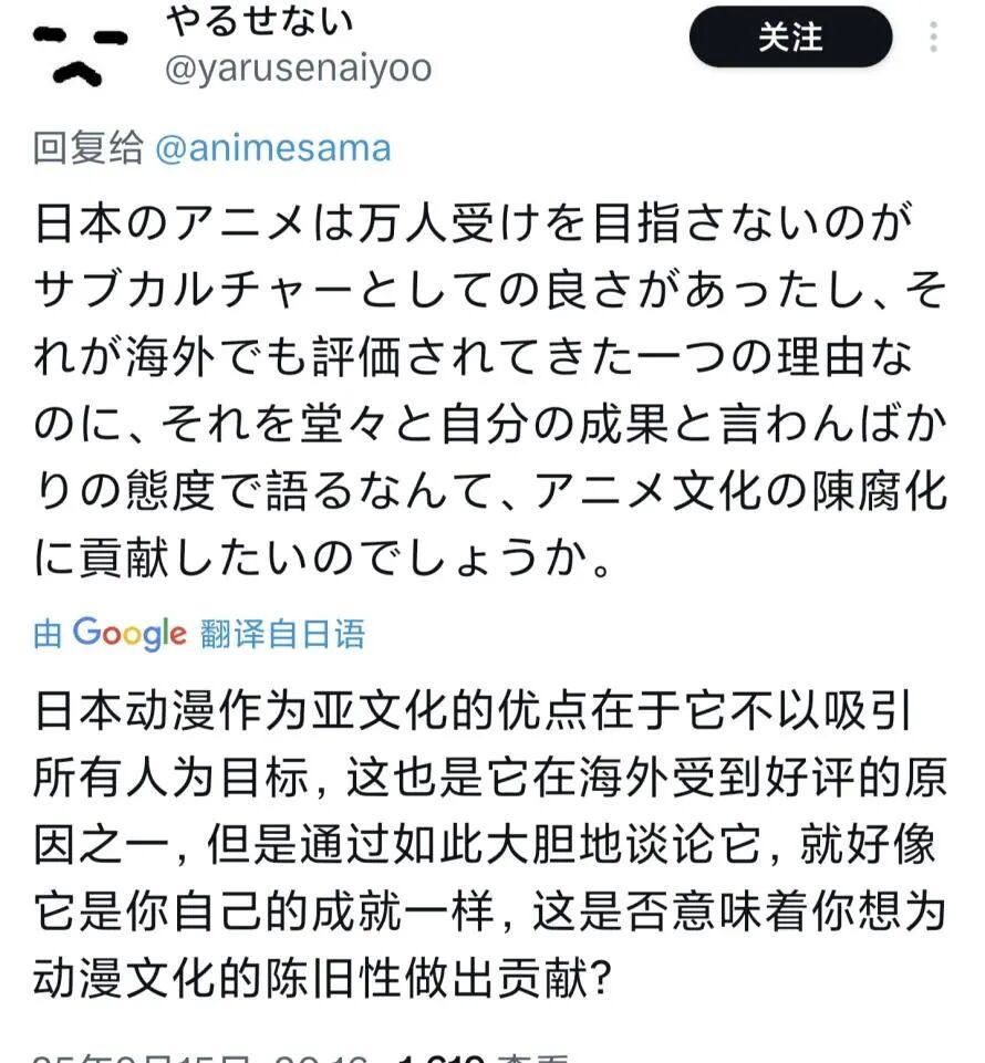 更有日本网友犀利的指出:日本动漫作为亚文化之所以能在海外吸引那么多粉丝,就是因为从不以吸引所有人为目标。而且你(指吉田)说的这么大义凛然,整的跟这部动画的成功是你自己的功劳似的。