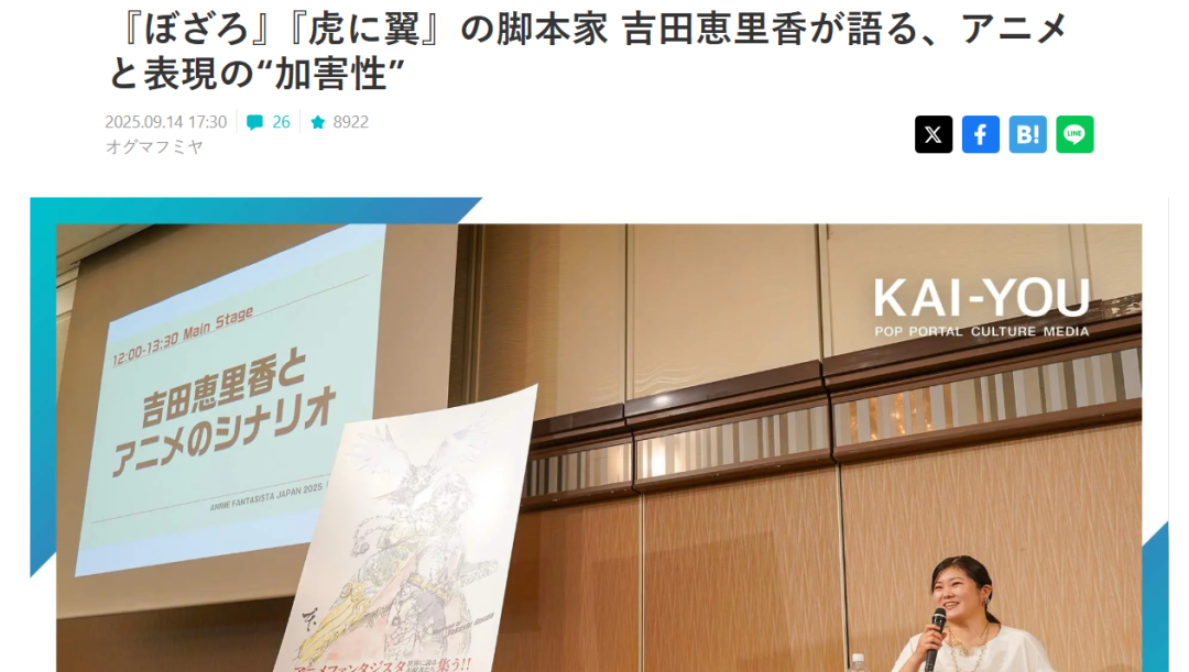 这次被炎上的是《孤独摇滚》动画的编剧吉田惠里香;事情是这样,最近日媒KAI-YOU放出了一篇关与吉田惠里香的访谈内容,标题为:脚本家吉田恵里香が語る、アニメと表現の“加害性”——翻译:编剧吉田惠里香谈动漫表达的“危害性”