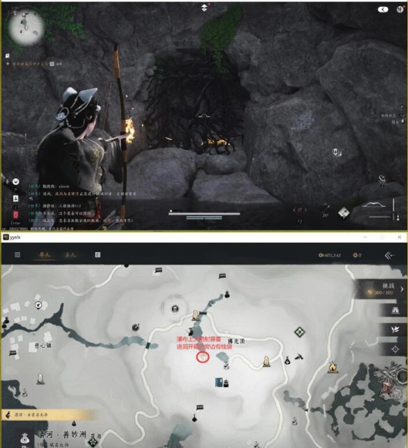 4、再前往下图位置,使用火箭射藤蔓,进入洞中在箱的旁边捡起绣着邪字的奇怪钱袋;