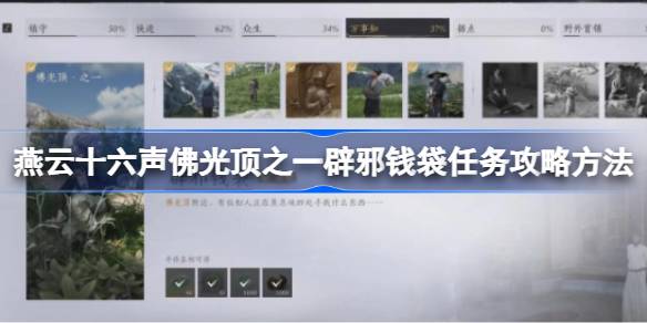 燕云十六声是一款武侠类型的动作冒险手游,在游戏里面每一个地区可以探索的地方都是非常繁多的,而且任务也是层出不穷,那么游戏中的佛光顶之一辟邪钱袋任务怎么做呢,下面就让我们来看看燕云十六声佛光顶之一辟邪钱袋任务攻略方法。